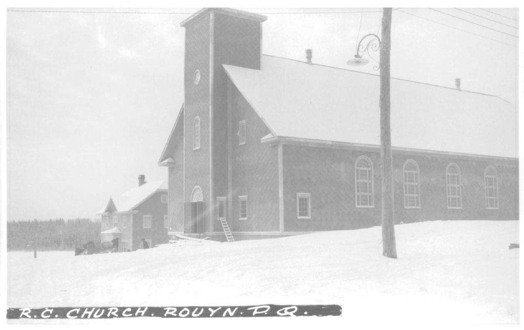 Vue du presbytère et de l'Église St-Michel sur l'avenue Du Portage à Rouyn, [vers 1927-1928], Archives nationales à Rouyn-Noranda, Fonds Fonderie Horne, (08Y,P123,S1,P172), Vavasour & Dick.