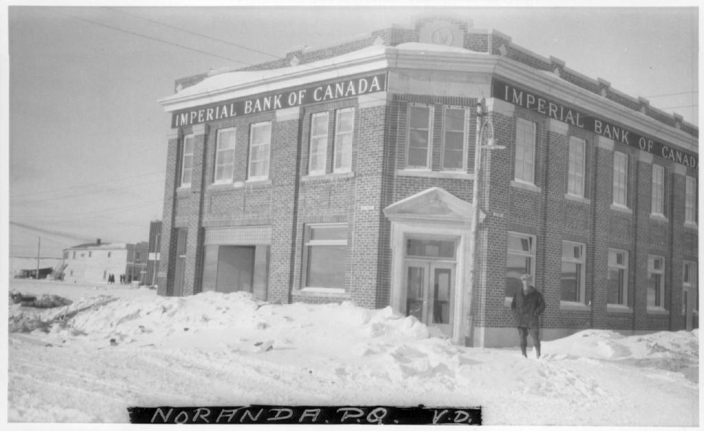Vue de l'édifice de la Banque Impériale du Canada à Noranda, [entre 1927 et 1933], Archives nationales à Rouyn-Noranda, Fonds Fonderie Horne, (08Y,P123,S1,P317), Vavasour & Dick.