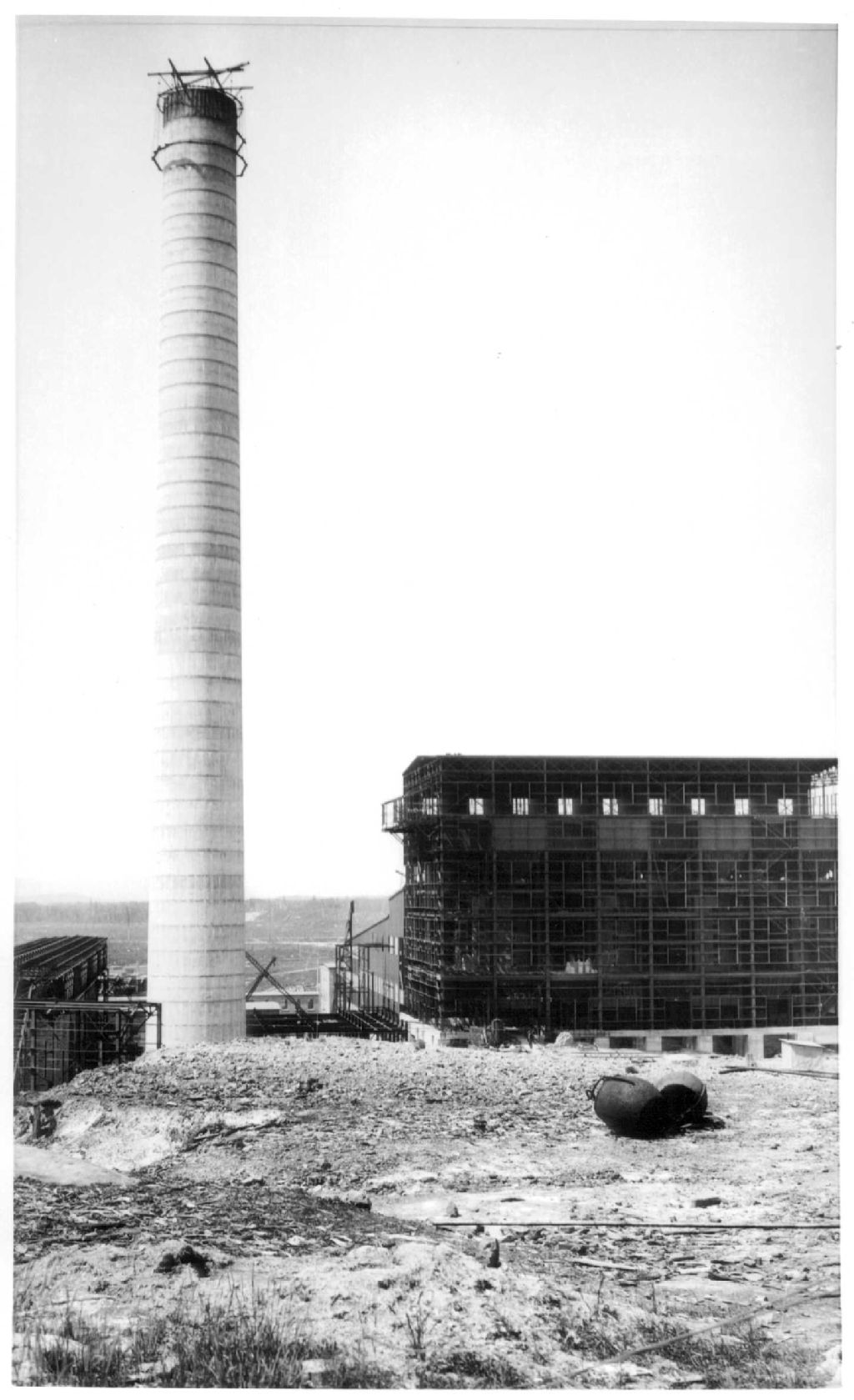 Construction de la première cheminée et de l'usine de smeltage de la mine Noranda, [vers 1926-1927], Archives nationales à Rouyn-Noranda, Fonds Fonderie Horne, (08Y,P123,S1,P389), Vavasour & Dick.