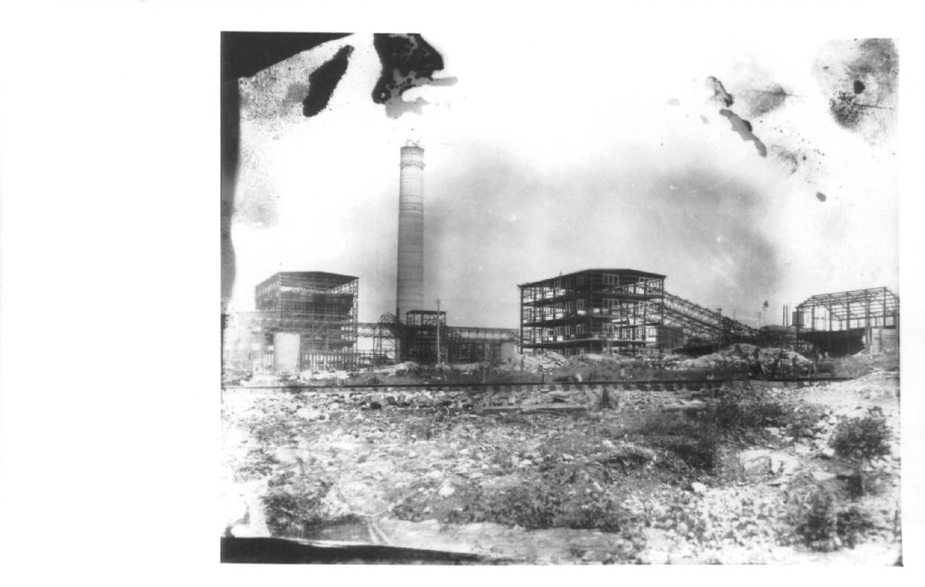 Construction de la première cheminée et de l'usine de smeltage de la mine Noranda, [vers 1926-1927], Archives nationales à Rouyn-Noranda, Fonds Fonderie Horne, (08Y,P123,S1,P398), Vavasour & Dick.