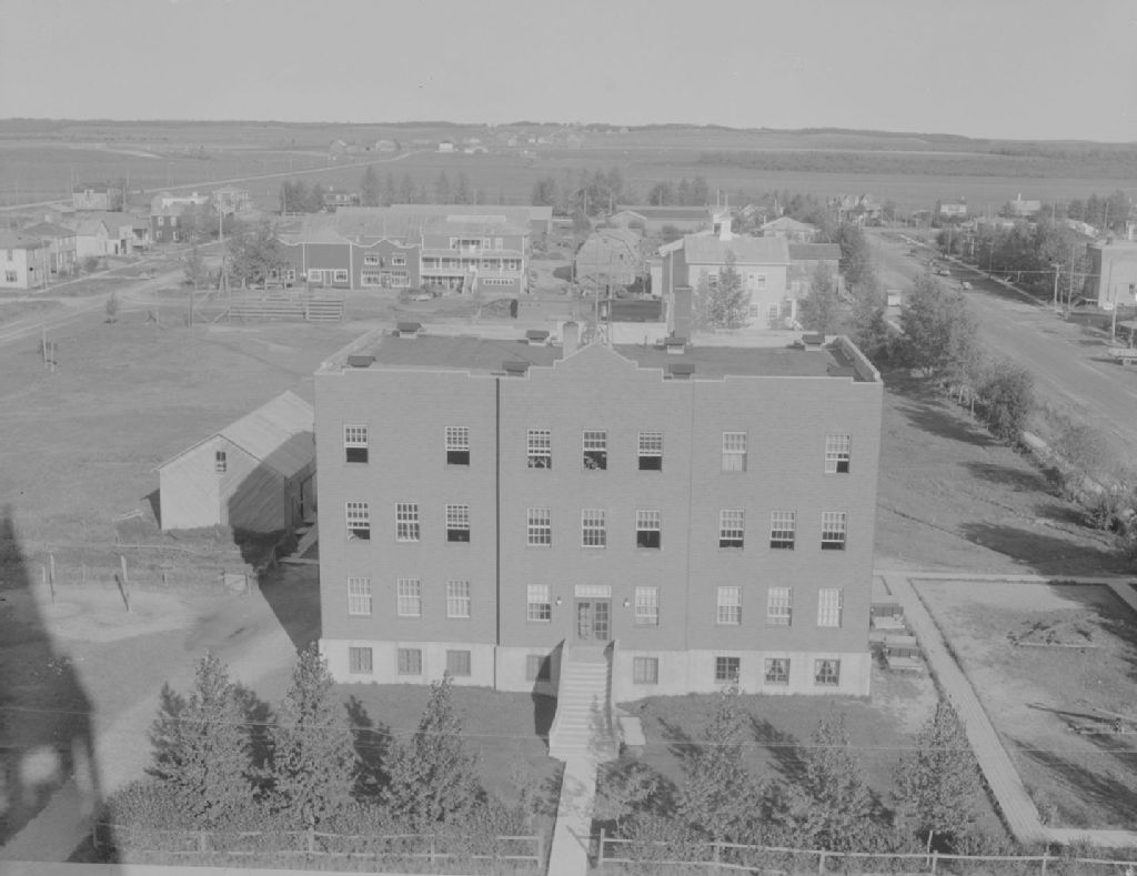 Vue aérienne du pensionnat et de l'école pour filles de La Sarre