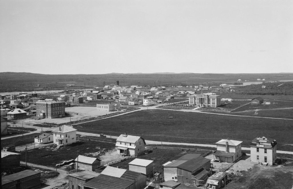 Vue générale de la ville d'Amos, Abitibi. On y voit le palais de justice au centre à droite., 1927-1928, Archives nationales à Rouyn-Noranda, Fonds Canadien National, (08Y,P213,P94), Canadien National.