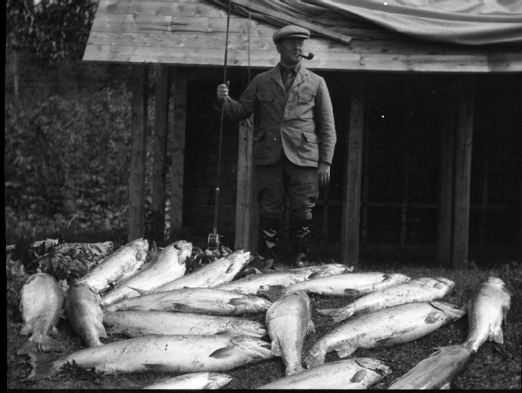 Pêcheur avec un saumon, 1923, Archives nationales à Sept-Îles, Fonds Mitchell Campbell, (09N,P41,S4,P15), Campbell, Mitchell, gérant Club de pêche Moisie, époque 1936-1980.