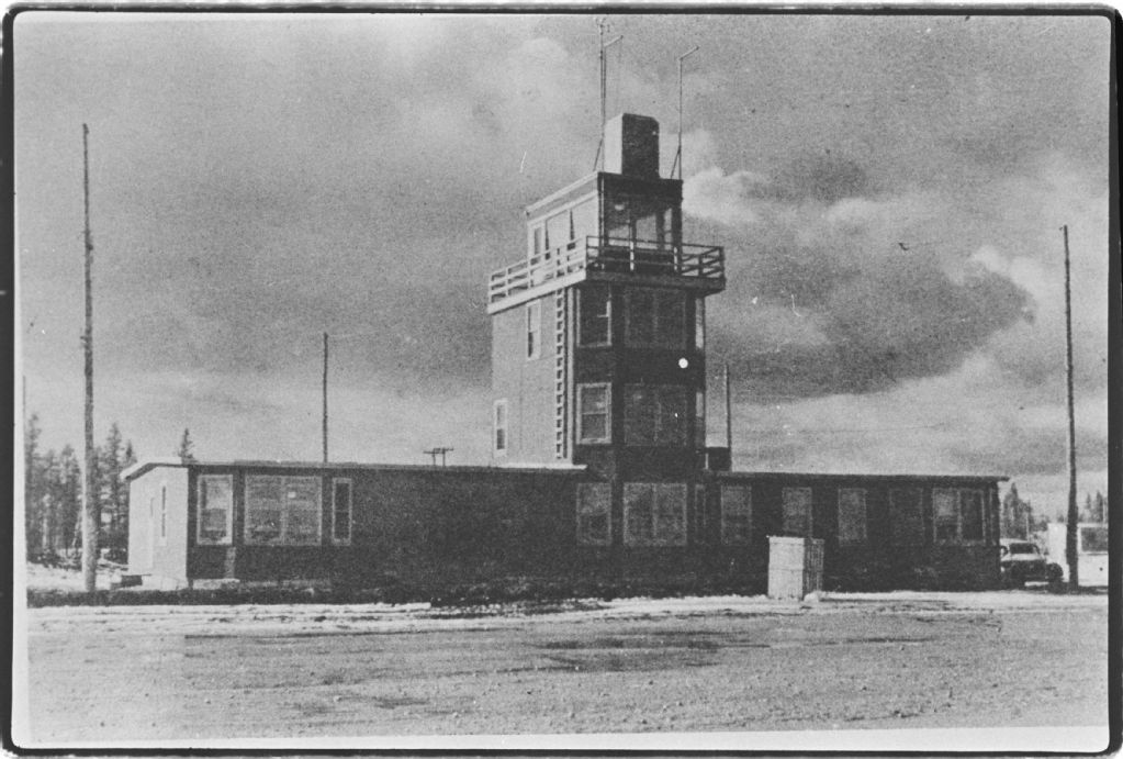 Aérogare de Sept-Îles, Négatif reproduit en 1984 (original créé vers 1950), Archives nationales à Sept-Îles, Collection Société historique du Golfe, (09N,P6,S3,D4,P125), Société historique du Golfe.
