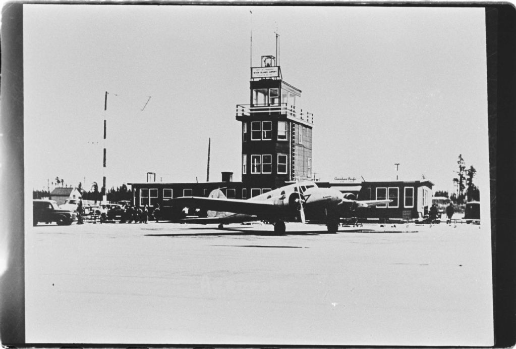 Avion à l'aéroport de Sept-Îles, Négatif reproduit en 1984 (original créé vers 1950), Archives nationales à Sept-Îles, Collection Société historique du Golfe, (09N,P6,S3,D4,P254), Société historique du Golfe.