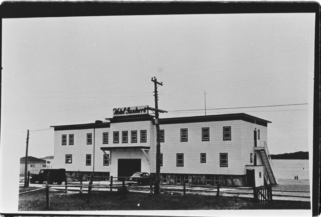 Hôtel Santerre de Sept-Îles, Négatif reproduit en 1984 (original créé vers 1960), Archives nationales à Sept-Îles, Collection Société historique du Golfe, (09N,P6,S3,D4,P323), Société historique du Golfe.