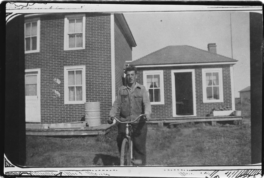 Donat Jomphe devant la maison de Samuel Lejeune, Négatif reproduit en 1984 (original créé vers 1940), Archives nationales à Sept-Îles, Collection Société historique du Golfe, (09N,P6,S3,D4,P431), Société historique du Golfe.