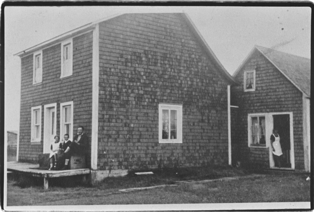 Jeanne Desmond, Raoul et Joachim Porlier devant la maison de Félix Porlier de Moisie