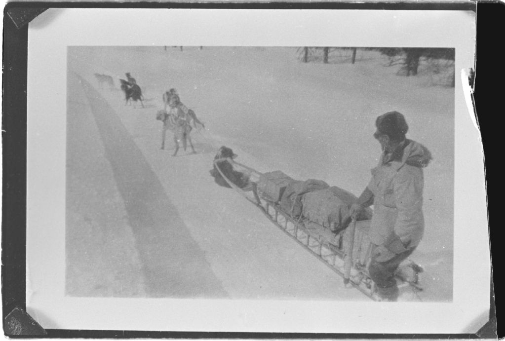 Traîneau et attelage de chiens, Négatif reproduit en 1984 (original créé vers 1940), Archives nationales à Sept-Îles, Collection Société historique du Golfe, (09N,P6,S3,D4,P623), Société historique du Golfe.