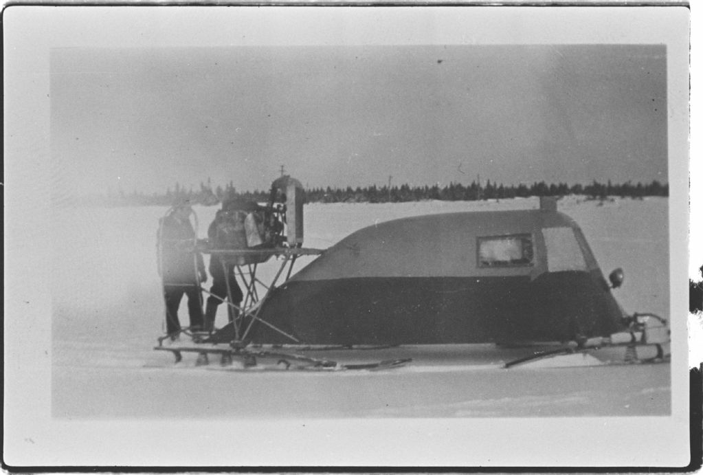 Autoneige, Négatif reproduit en 1984 (original créé vers 1940), Archives nationales à Sept-Îles, Collection Société historique du Golfe, (09N,P6,S3,D4,P627), Société historique du Golfe.