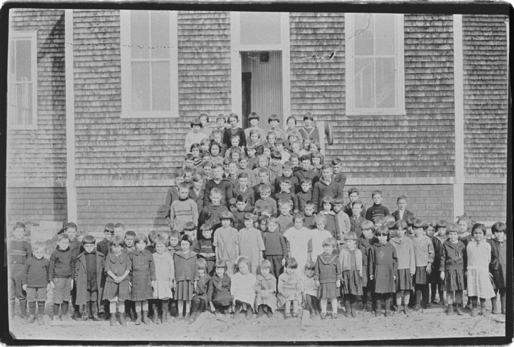 Écoliers de Sept-Îles, Négatif reproduit en 1984 (original créé en 1922), Archives nationales à Sept-Îles, Collection Société historique du Golfe, (09N,P6,S3,D4,P676), Société historique du Golfe.
