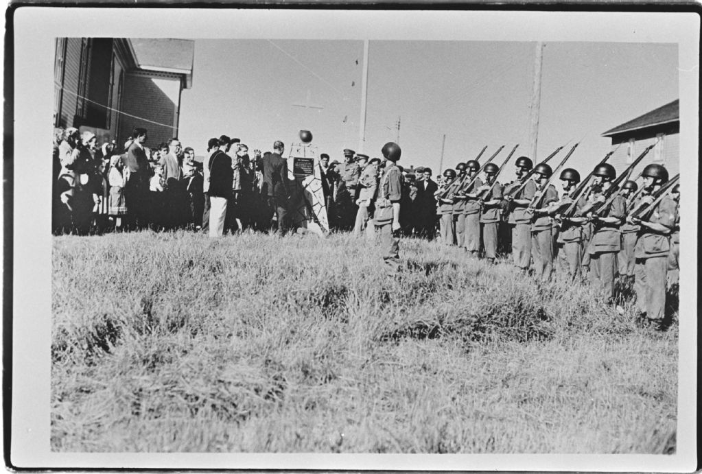 Inauguration d'une plaque commémorative en mémoire de soldats septiliens lors des fêtes du tricentenaire de Sept-Îles en présence de soldats du Royal 22e Régiment, Négatif reproduit en 1984 (original créé en 1951), Archives nationales à Sept-Îles, Collection Société historique du Golfe, (09N,P6,S3,D4,P95), Société historique du Golfe.