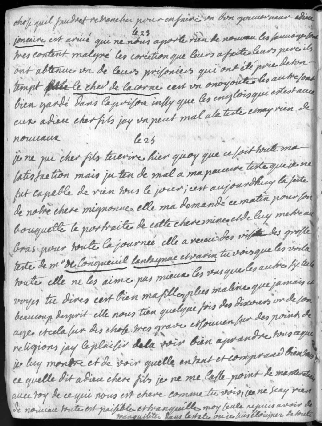 Retour de Joncaire (Philippe-Thomas Chabert de Joncaire) qui n'apporte aucune nouvelle. Les sauvages sont contents, ils ont repris l'un des leurs (un Oneyout) qui fut fait prisonnier du temps de La Corne (Louis de La Corne dit chevalier de La Corne). Les autres sont bien gardés ainsi que les Anglais qui les accompagnaient