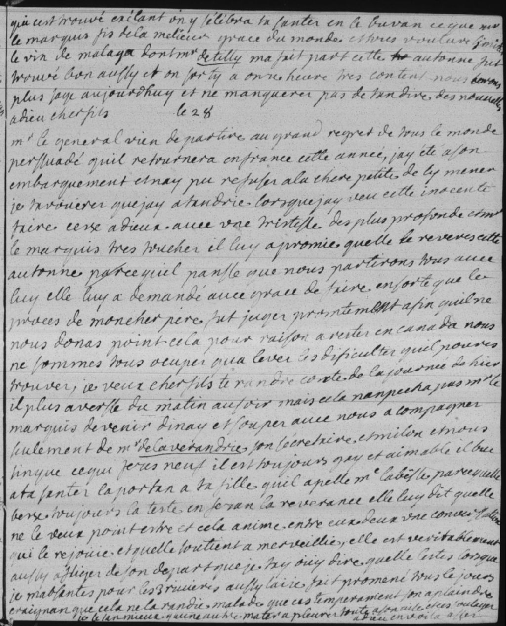 Monsieur le général (Roland-Michel Barrin de La Galissonière dit marquis de La Galissonière) est parti pour Québec, et probablement pour la France. La petite (Marie-Catherine de Villebois de La Rouvillière) le pria de faire juger l'affaire du père de Madame Bégon (Étienne Rocbert de La Morandière) le plus tôt possible, pour que le départ en France ne soit pas retardé. Hier, il plut toute la journée, mais cela n'empêcha pas le marquis de venir pour le souper