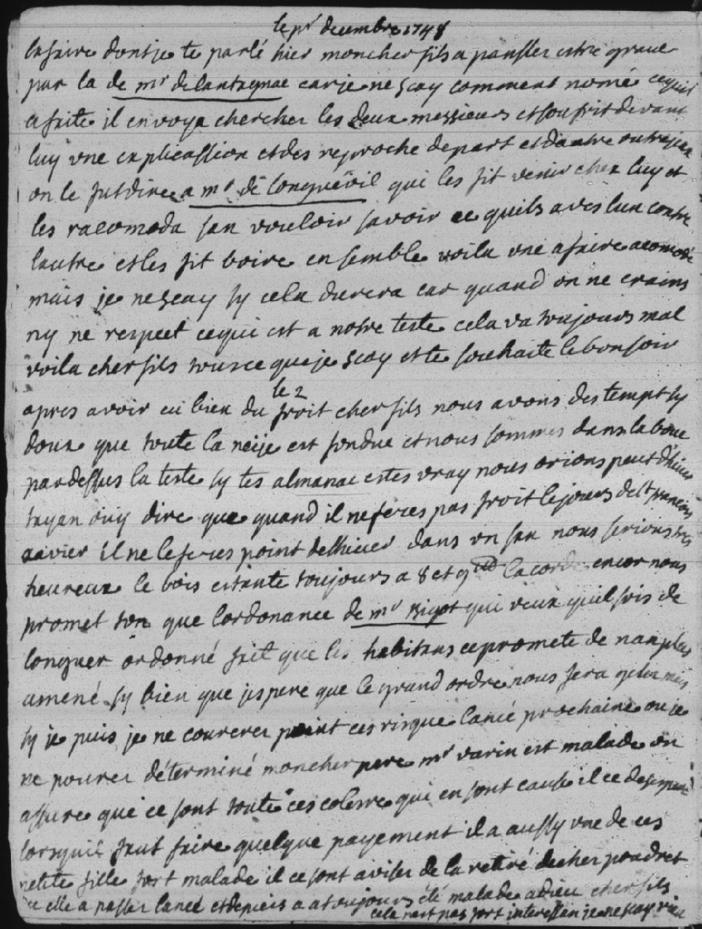 Monsieur de Lantagnac (Gaspard Adhémar de Lantagnac) chercha à résoudre le conflit opposant les deux Messieurs en écoutant les reproches formulés de part et d'autre. Monsieur de Longueuil (Charles Le Moyne de Longueuil) ayant eu vent de la procédure fit venir les deux contrevenants et les réconcilia devant un verre de vin, sans entendre les plaintes de chacun. Madame Bégon (Marie-Isabelle-Élisabeth Bégon) ne croit pas que cette méthode soit efficace
