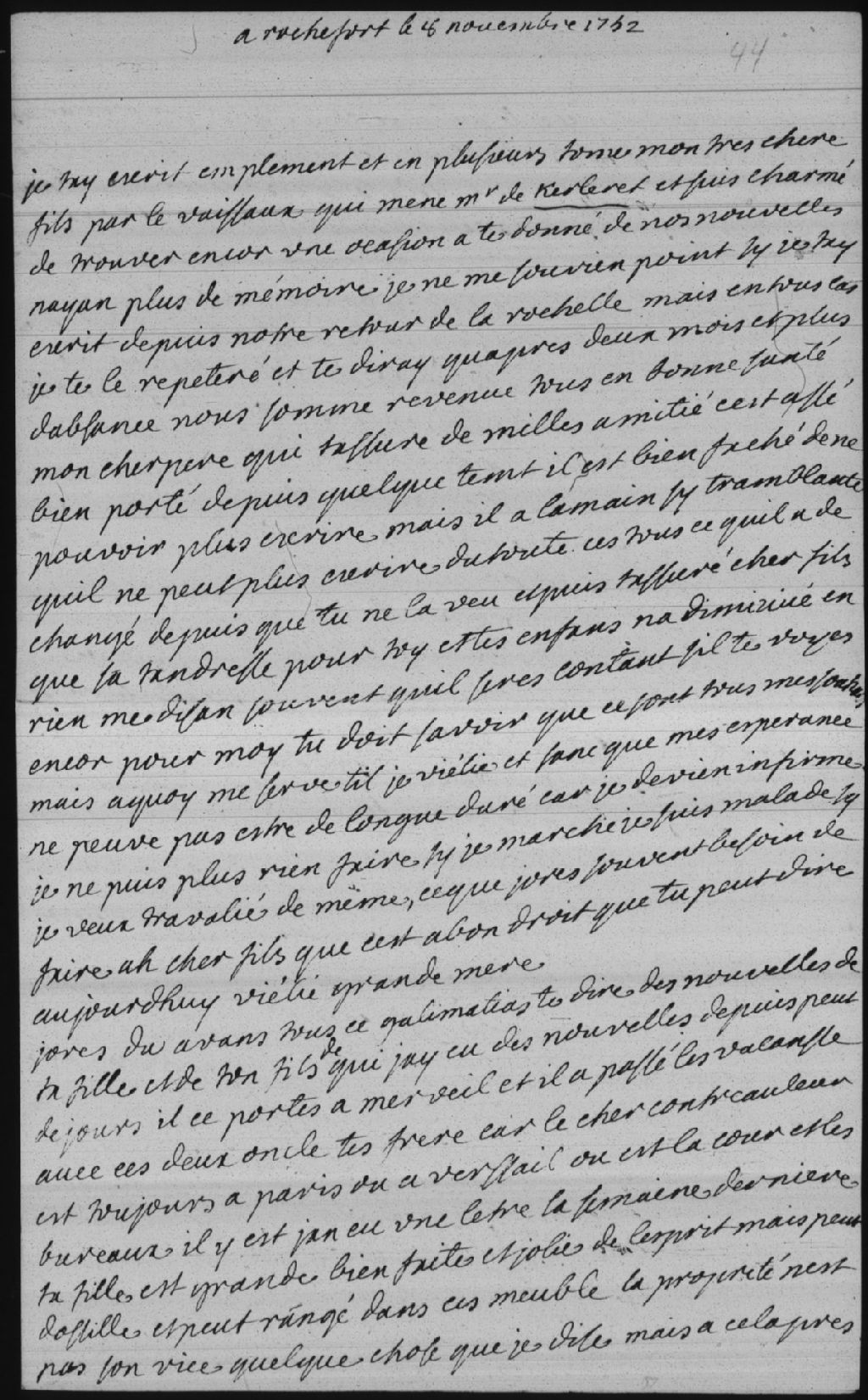 Lettre de Madame Bégon, 8 novembre 1752, Archives nationales à Québec, Fonds Famille Bégon, (03Q,P2,P430).