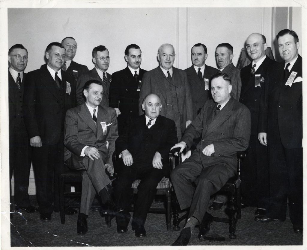 T.-D. Bouchard assis au centre avec un groupe d'hommes non-identifiés, [1940?], Archives nationales à Québec, Fonds Télesphore-Damien Bouchard, (03Q,P10,S1,P122), Lucien Desjardins photographe, La Presse.