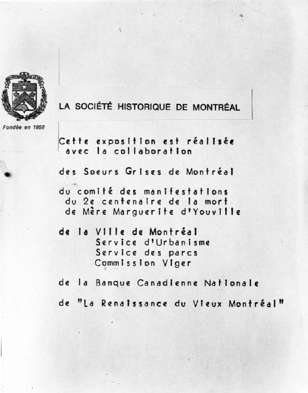 Il s'agit du panneau annonçant les partenaires de l'exposition mise en place par la Société Historique de Montréal, pour le 2e centenaire de la mort de Marguerite d'Youville (1701-1771)