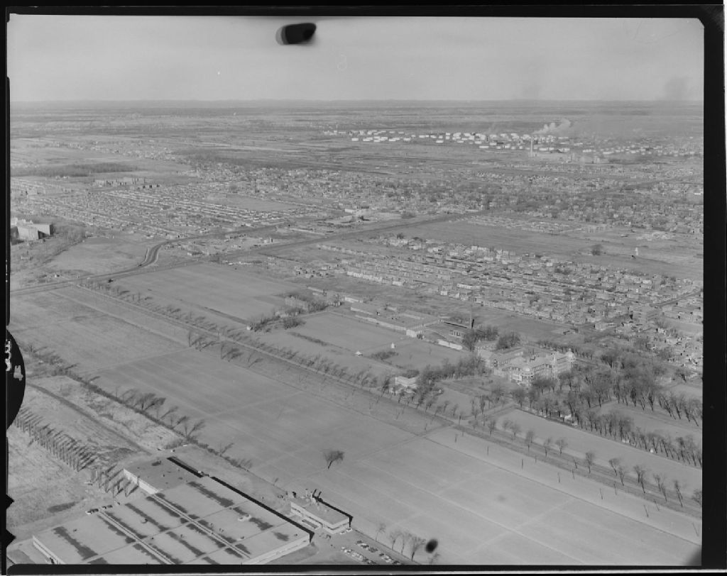 Vue aérienne du secteur est de Montréal, Vers 1950, Archives nationales à Montréal, Fonds Armour Landry, (06M,P97,S1,D14173-14174), Armour Landry.
