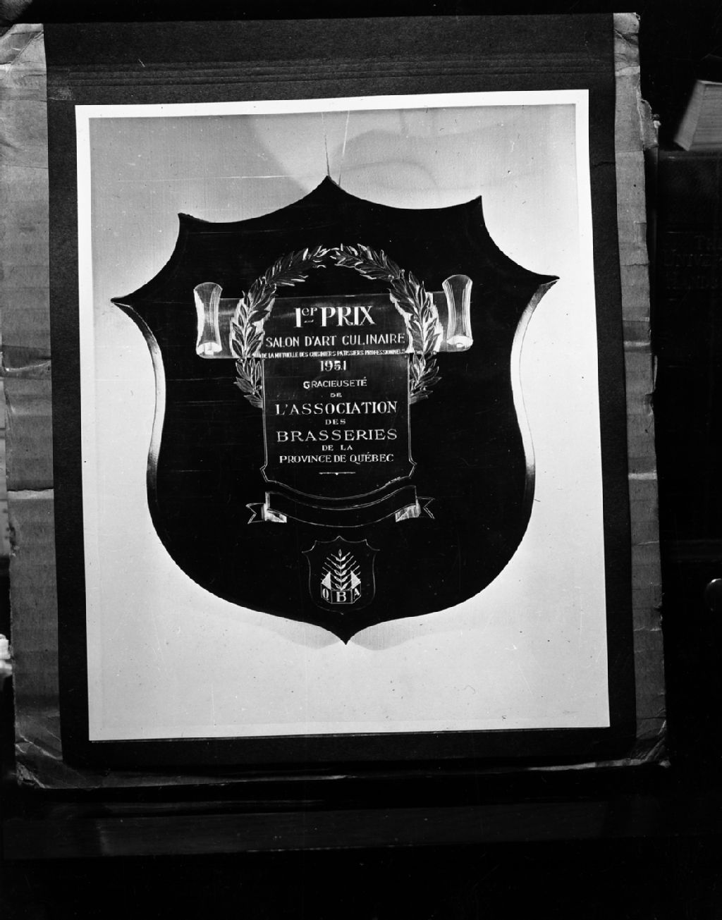 Le trophée du premier prix au Salon de l'art culinaire, organisé par le ministère du Commerce et de l'Industrie du Québec, à Montréal (probablement au Palais du commerce)