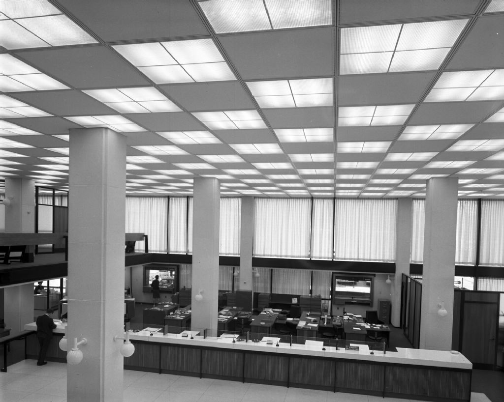Le dossier comprend des clichés du bureau du directeur, des comptoirs et des guichets, des bureaux des employées, d'une salle de réunion, du coffre-fort, d'une salle de repos, du stationnement ainsi que du bâtiment
