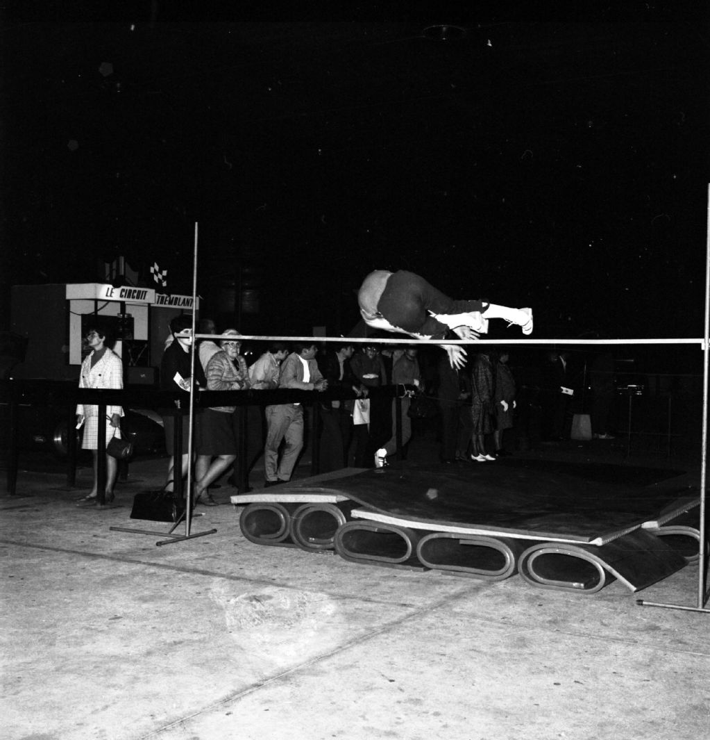 Un homme effectue un saut en hauteur à l'occasion de la Semaine de la pleine forme au Pavillon du Québec, à l'exposition permanente Terre des Hommes à Montréal, Septembre 1968, Archives nationales à Montréal, Fonds Armour Landry, (06M,P97,S1,D5652-5653), Armour Landry.