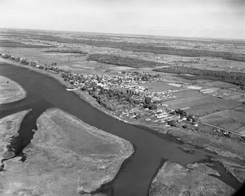 - Ce dossier montre deux photographies aériennes du village de Contrecoeur, traversé par la route 3, devenue la route 132, et bordé par le fleuve Saint-Laurent