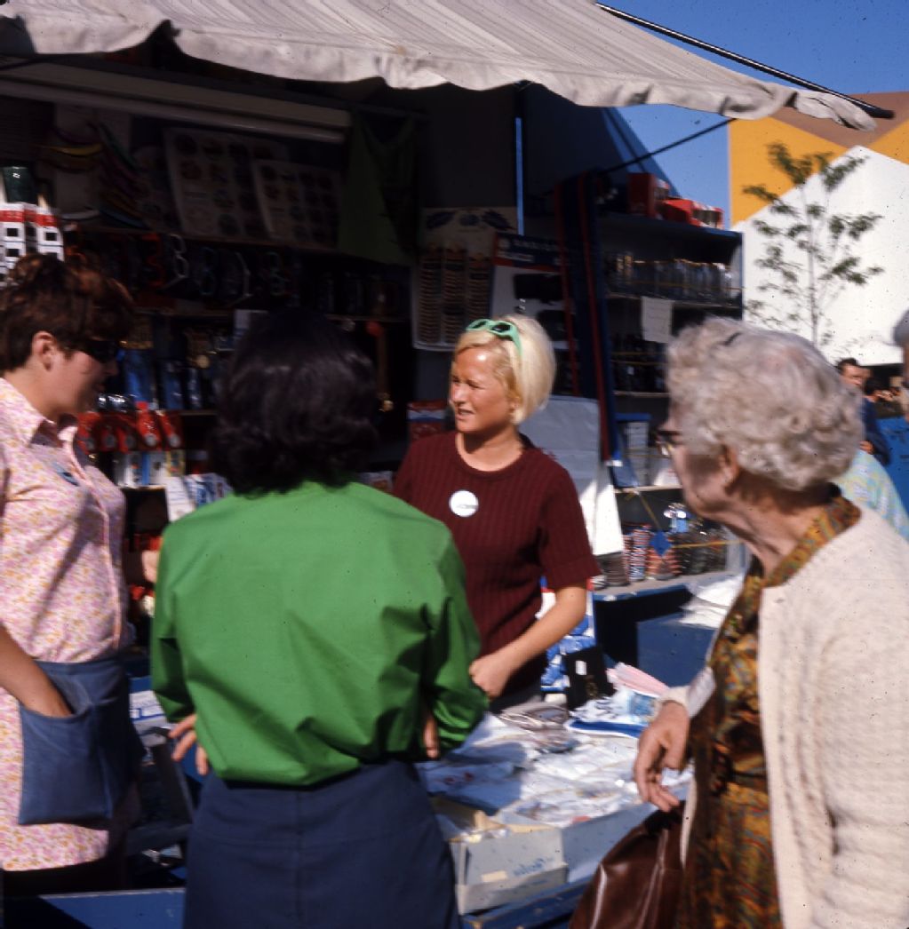 Exposition universelle de 1967; visiteurs devant un kiosque de souvenirs