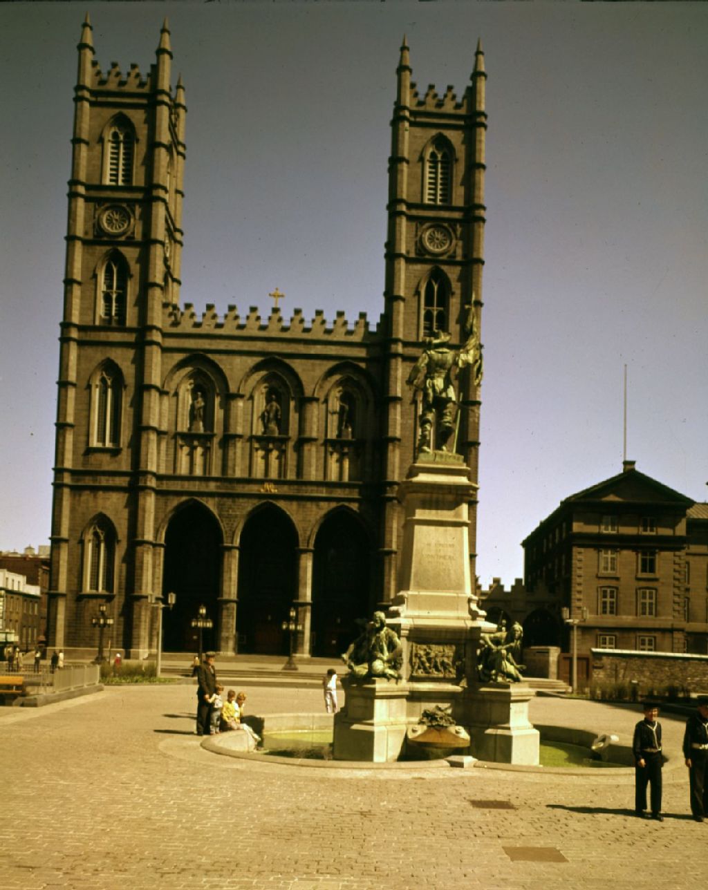 Place d'Armes à Montréal: facade de l'église Notre-Dame et le monument à la mémoire de Paul de Chomedey, sieur de Maisonneuve, [Vers 1965], Archives nationales à Montréal, Fonds Armour Landry, (06M,P97,S1,D7948-7948), Armour Landry.