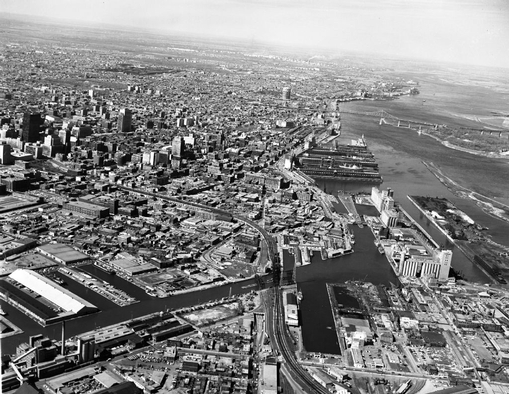 Vue aérienne des installations portuaires et du centre-ville de Montréal