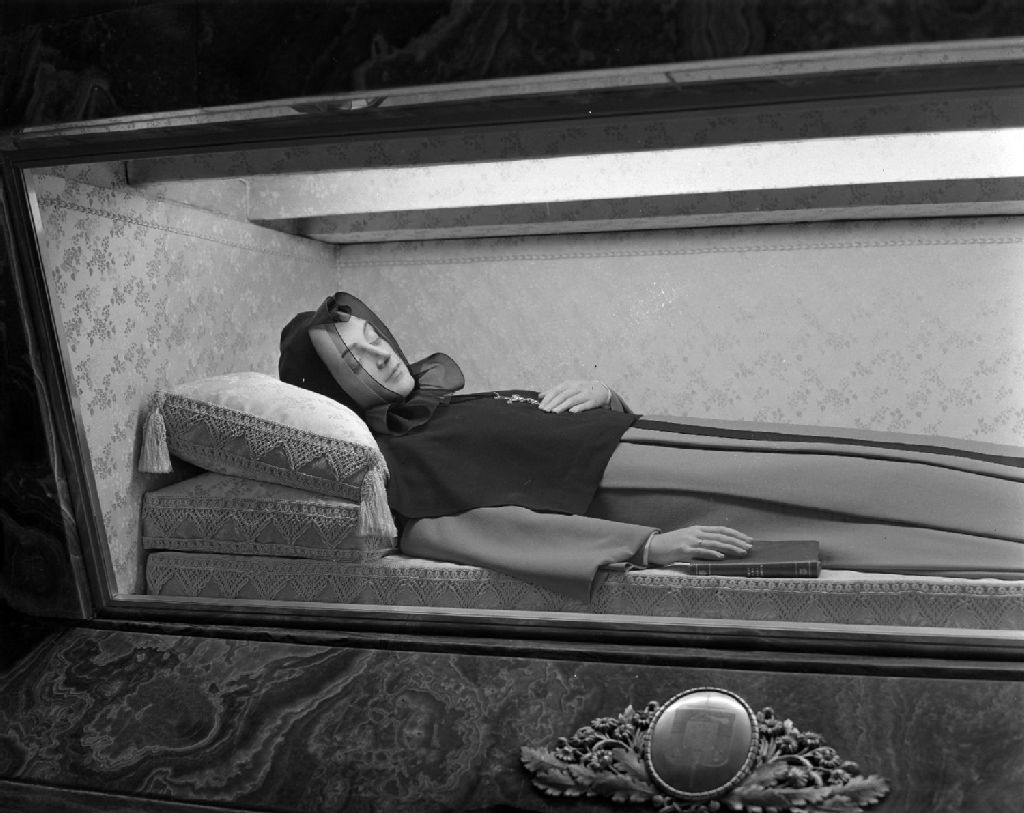 Le gisant de Marguerite d'Youville entreposé à la Chapelle de la Maison-mère des Soeurs Grises de Montréal, [Vers 1960], Archives nationales à Montréal, Fonds Armour Landry, (06M,P97,S1,D9998-9999), Armour Landry.