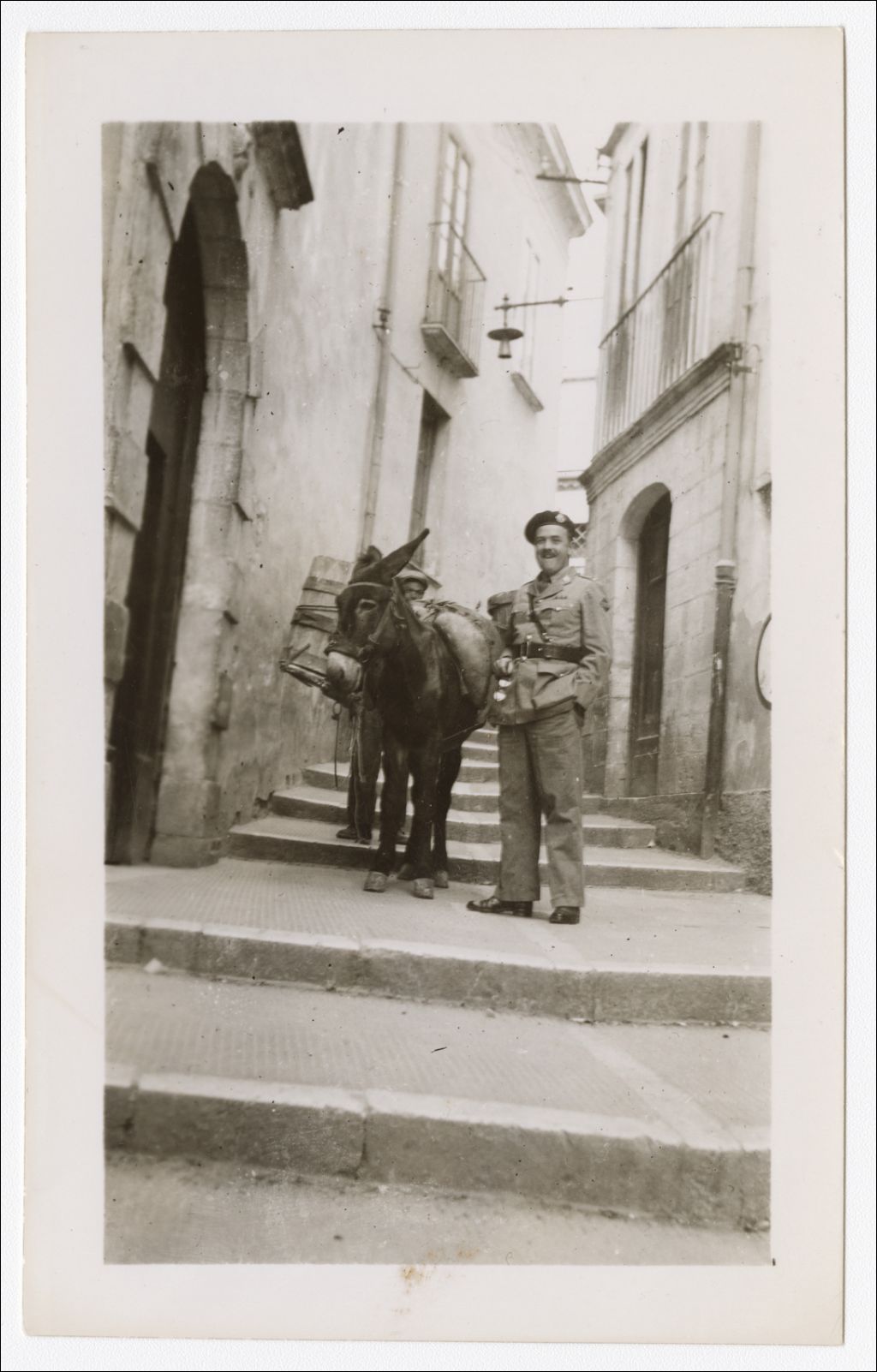 Cette photographie illustre un soldat et un âne chargé dans une ruelle en escalier. Le soldat a une paire de lunettes de soleil à la main. Derrière l'âne, on aperçoit la silhouette d'un autre homme. Cette photographie a été prise entre les années 1939 et 1945