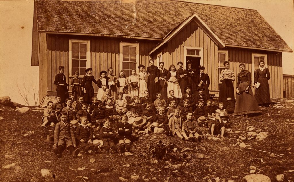 Enfants et leurs institutrices à l'extérieur d'une école de rang