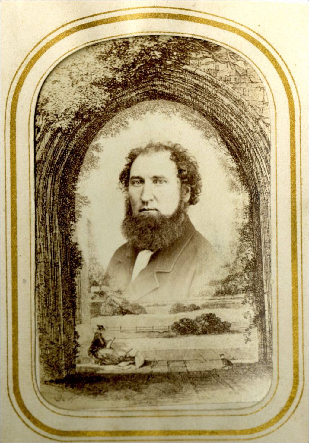 Montage photo : portrait d'un homme, cheveux frisés et barbe fournie, avec jardin