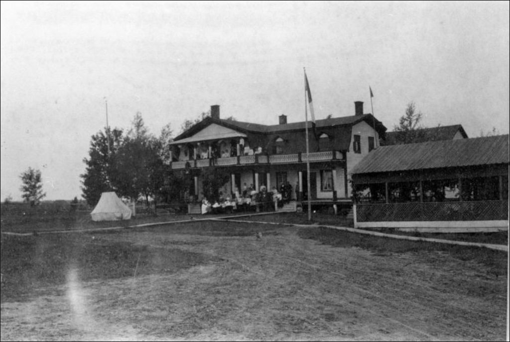 Villa et kiosque de la Villa Chabot à Papineauville : on y voit des gens devant et au balcon de la villa