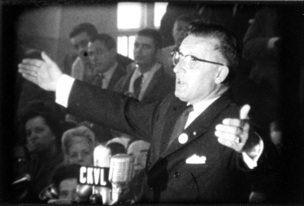 Réal Caouette, candidat créditiste, prononce un discours au Marché Atwater à Montréal, 24 février 1963, dans le cadre de la campagne électorale pour les élections fédérales du 8 avril 1963