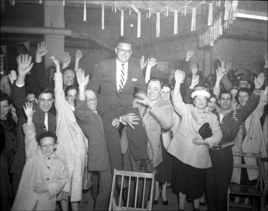 Réal Caouette porté par ses partisans à l'assemblée de l'ouverture officielle de la campagne électorale au sous-sol de l'église Immaculée-Conception à Rouyn