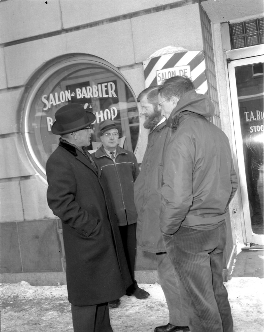 Réal Caouette (extrême gauche) s'entretient sur l'avenue Principale à Rouyn avec des électeurs de la circonscription électorale fédérale du comté de Villeneuve