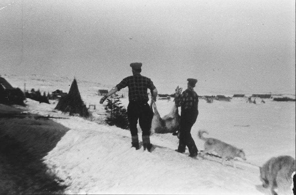 Daniel Nadeau et ses amis revenant de la chasse au caribou, 1950, Archives nationales à Sept-Îles, Fonds Groupe d'action et de développement économique et culturel de la Basse Côte-Nord, (09N,P12,S2,P209), Groupe d'action et de développement économique et culturel Basse-Côte-Nord.
