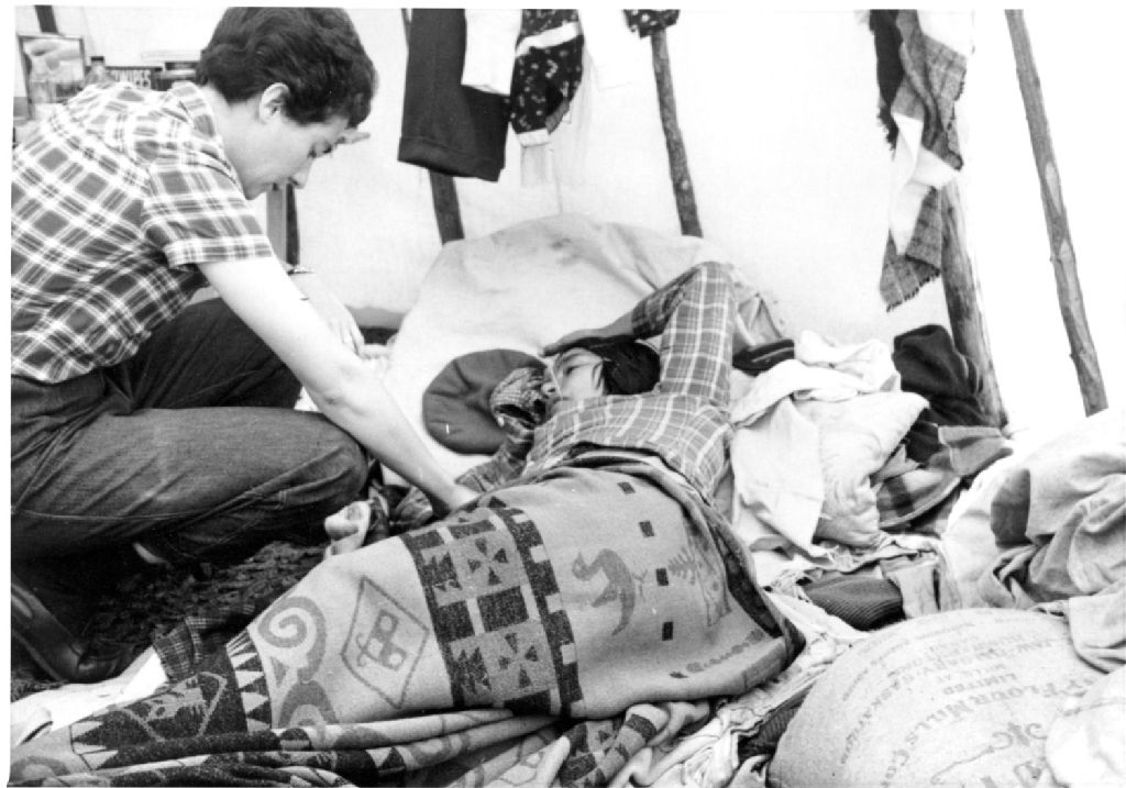 La photographie montre l'infirmière Jeanne d'Arc Gagnon qui procure les soins nécessaires à Thérèse Cartouche, à La Romaine. Les visites aux malades se font sur demande à leur domicile, alors que les malades ambulants sont accueillis au dispensaire 24 heures par jour