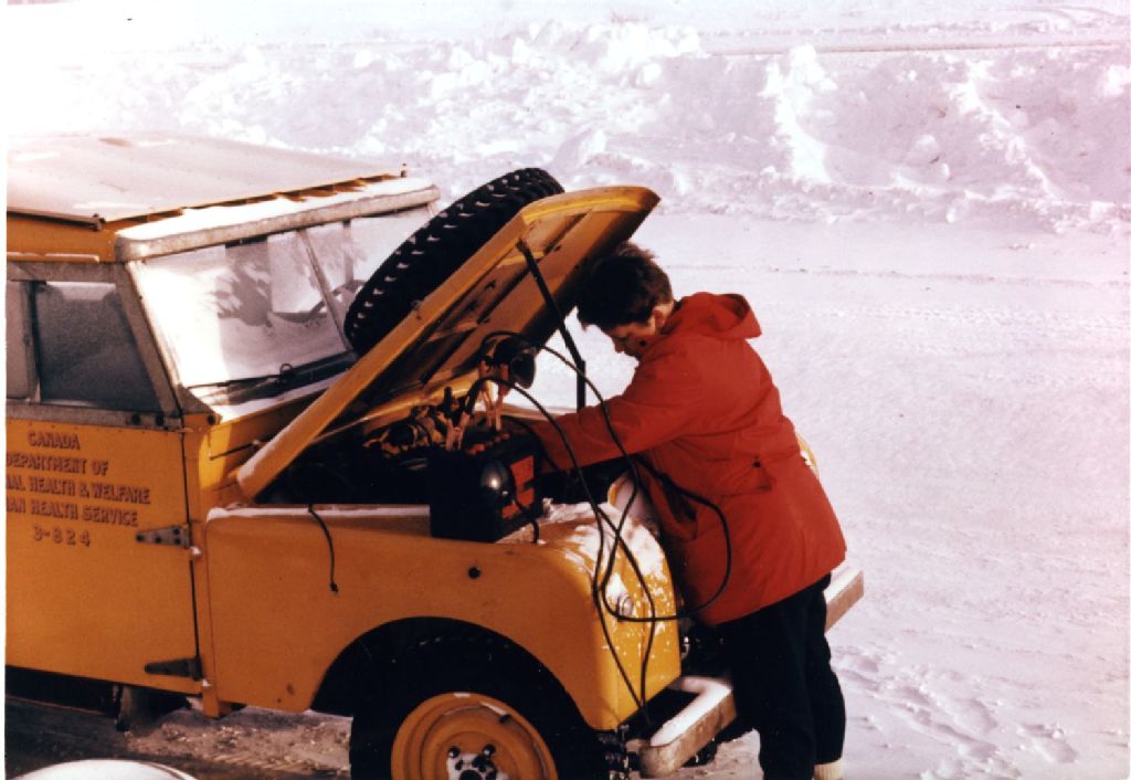 Marcelle tente l'impossible pour faire démarrer la jeep, 1949-1960, Archives nationales à Sept-Îles, Fonds Pauline Laurin, (09N,P60,S1,SS5,P26), Laurin, Pauline.