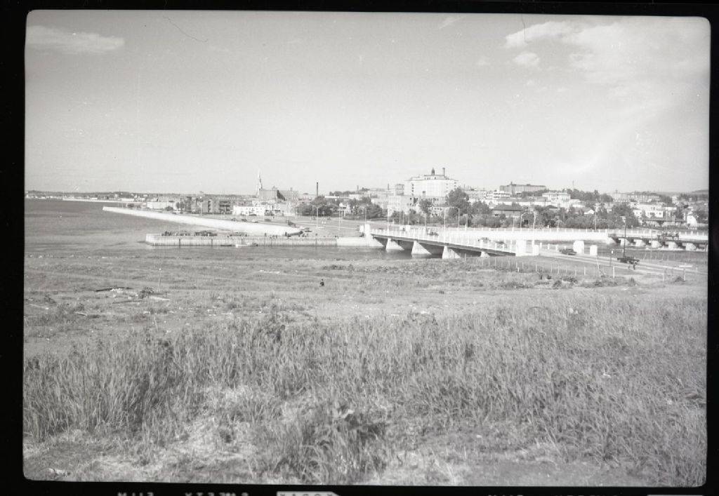 Pont et brise-lame à l'embouchure de la rivière Rimouski, [entre 1960 et 1969], Archives nationales à Rimouski, Fonds J.-Gérard Lacombe (En traitement), (01R,P24,S3,SS3,D137,P3), J.-Gérard Lacombe.