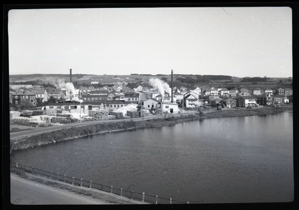 On aperçoit en arrière plan le moulin Dionne & Frères qui fait face à la rivière Rimouski.