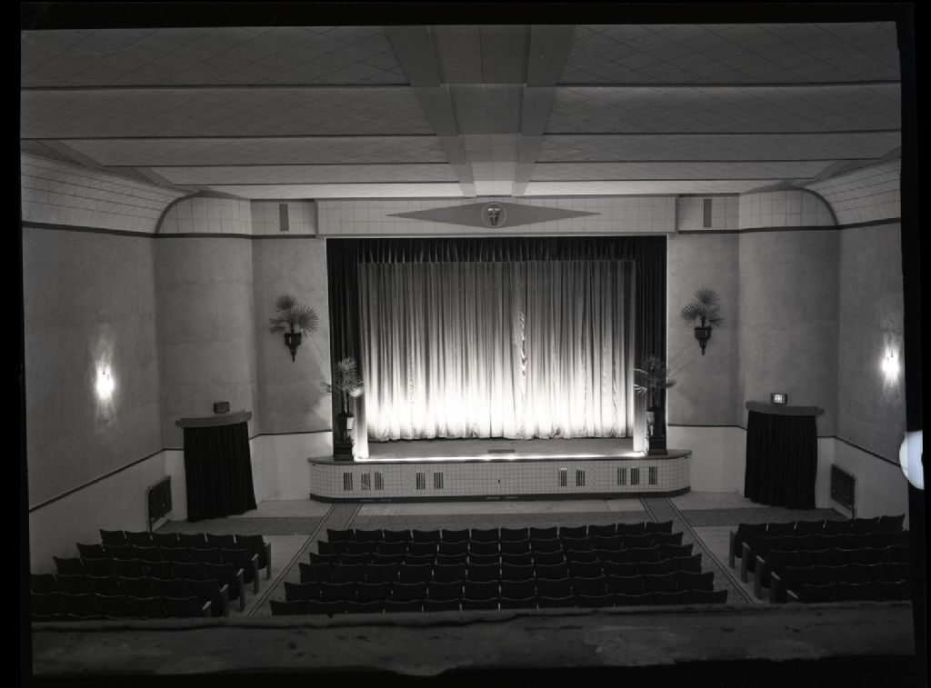 - Le dossier présente différentes vues de l'intérieur de l'auditorium. On y aperçoit la salle avec la scène, l'écran de projection et les sièges en avant plan. Finalement une vue de l¿entrée intérieure montrant les guichets en plan central, aperçu d¿une partie de la présentation du film à l¿affiche, escalier en arrière-plan.
