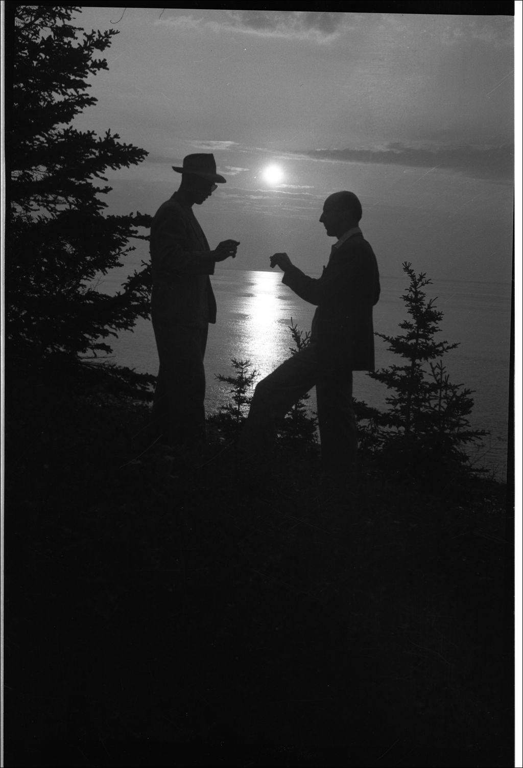 La photographie représente la silhouette de deux hommes, prise en contre-jour et face au Golfe du Saint-Laurent. L'un des deux hommes est Albert Leclerc.