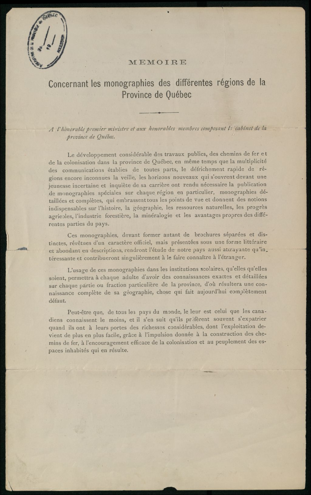 Mémoire concernant les monographies des différentes régions de la Province de Québec, 18 novembre 1887, Archives nationales à Québec, Fonds Arthur Buies, (03Q,P18,D31).