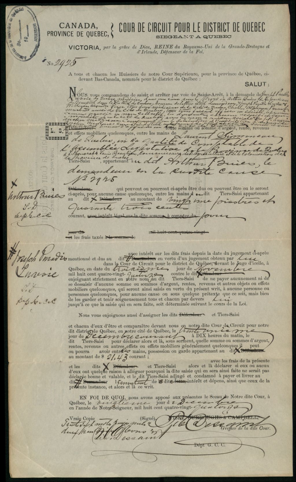 Saisie-arrêt après jugement de la Cour de circuit pour le district de Québec en faveur d'Arthur Buies, 2 et 31 décembre 1894, Archives nationales à Québec, Fonds Arthur Buies, (03Q,P18,D35).