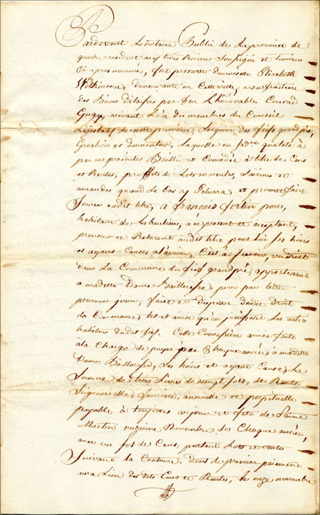 - Ce dossier contient des actes notariés s'étalant du 3 décembre 1788 au 28 novembre 1793. La personne en possesion du Fief est l'usufruitière de M. Gugy, dame Elisabeth Wilkinson