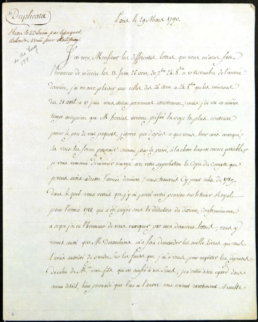 - Il a reçu les lettres que Chaussegros de Léry a écrites l'année précédente; il est content que ses lettres lui soient parvenues correctement mais il a remarqué en même temps que M. Herrier avait choisi la voie la plus coûteuse; il le remercie pour avoir approuvé le compte et lui envoie celui de 1789. Il lui explique les transactions qu'il a effectuées; il informe Chaussegros de Léry qu'il n'a pas de lettres de son fils garde du corps [Louis-René]. Il lui donne tout de même quelques nouvelles de celui-ci; il demande à Chaussegros de Léry de ne pas entrer dans aucun détail de leur situation, les papiers publics ne laissant surement rien à désirer à cet égard, ils auront entièrement détruits la nouvelle affreuse qu'il a reçue par la gazette de Bostonn [Révolution française]; il va se procurer les almanachs de cette année et lui faire parvenir par la voie ordinaire; il donne des nouvelles de son fils ingénieur [François-Joseph] et lui apprend qu'e celui-ci veut revenir en France en 1791 où il aura la croix de Saint-Louis; il demande à Chaussegros de Léry si sa lettre datée de novembre n'aurait pas été écrite en décembre, ce qui expliquerait la référence à l'affreuse nouvelle qu'il a reçue dans la gazette de Boston en octobre