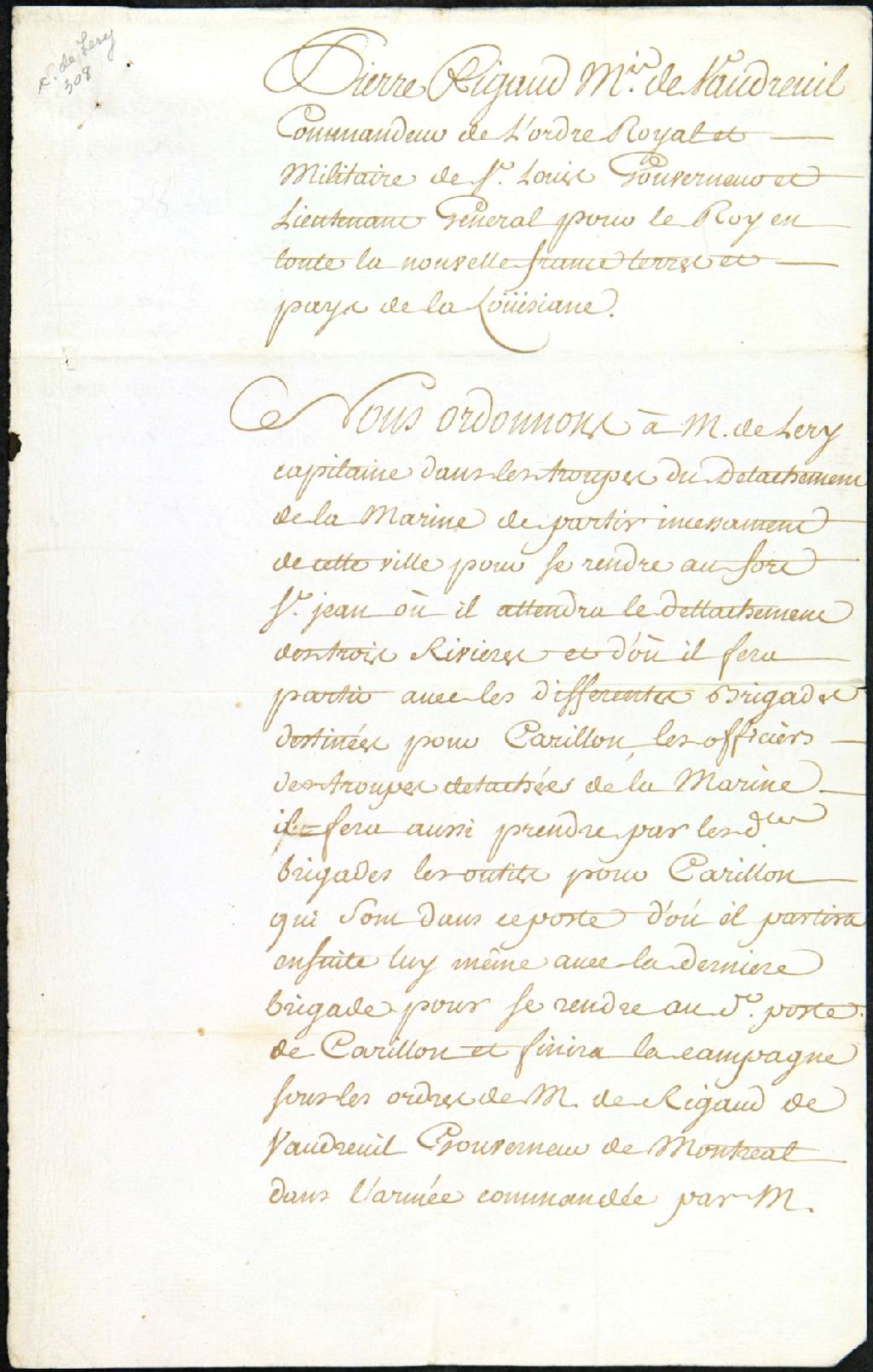 - Version intégrale légèrement normalisée : «Pierre Rigaud marquis de Vaudreuil commandeur de l'ordre royal et militaire de St-Louis [Saint-Louis] gouverneur et lieutenant général pour le Roi en toute la Nouvelle-France terres et pays de la Louisiane. Nous ordonnons à M. de Lery capitaine dans les troupes du détachement de la marine de partir incessamment de cette ville pour se rendre au fort St-Jean [Fort Saint-Jean] où il attendra le détachement des Trois-Rivières et d'où il fera partir avec les différentes brigades destinées pour Carillon [Fort Carillon], les officiers des troupes détachées de la marine il fera aussi prendre par lesdites brigades les outils pour Carillon qui sont dans ce poste d'où il partira ensuite lui-même avec la dernière brigade pour se rendre audit poste de Carillon et finira la campagne sous les ordres de M. de Rigaud de Vaudreuil gouverneur de Montréal dans l'armée commandée par monsieur le marquis de Montcalm [...]